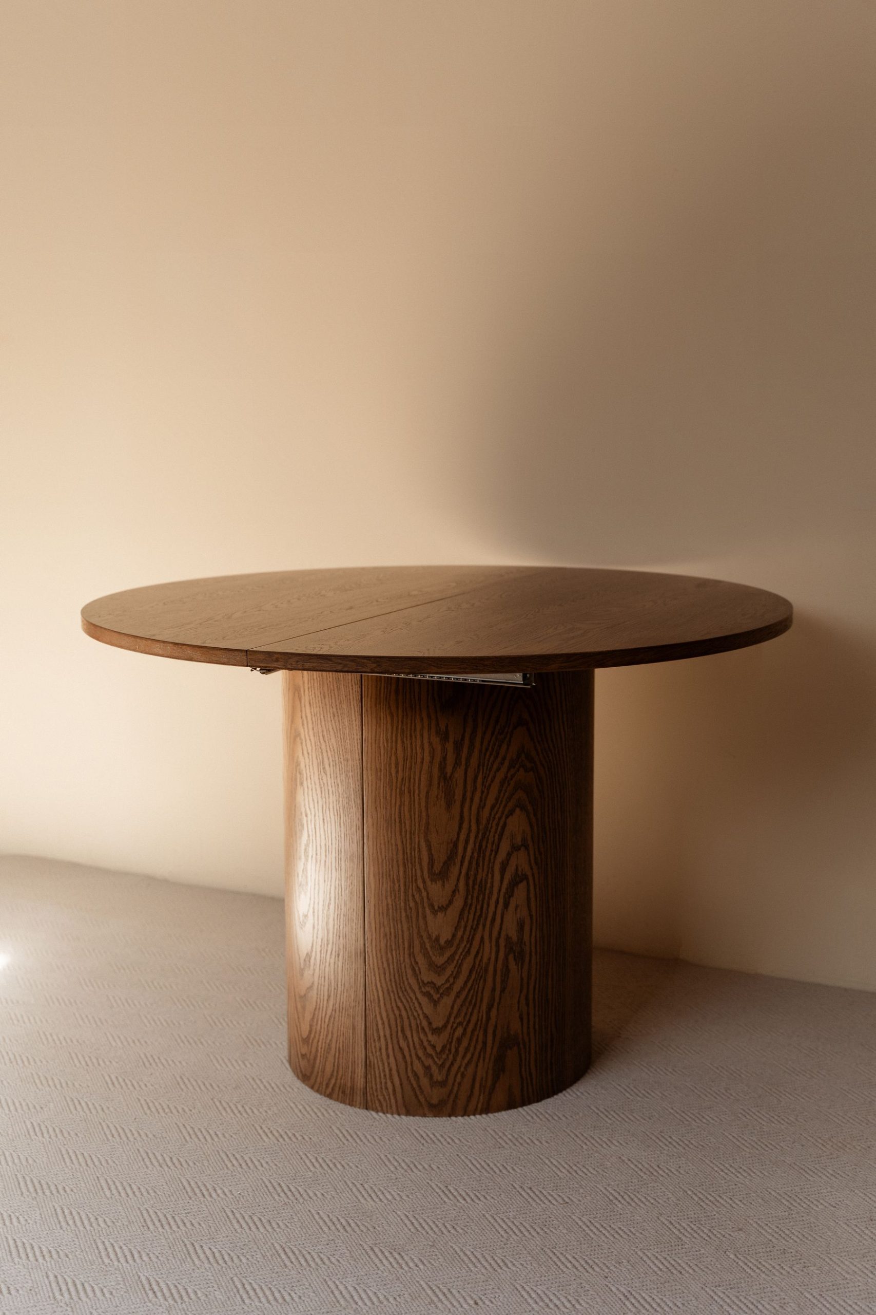 Круглый стол из массива дуба на цилиндрической опоре создаёт в комнате спокойный центр притяжения. В повседневной жизни за ним удобно завтракать и работать, а при необходимости столешница раздвигается, чтобы усадить больше гостей. Натуральная текстура дуба и лаконичная форма легко сочетаются с разным текстилем и стульями. Такой стол поддерживает порядок и помогает собирать всех за одним местом — от тихих будней до праздничных ужинов.