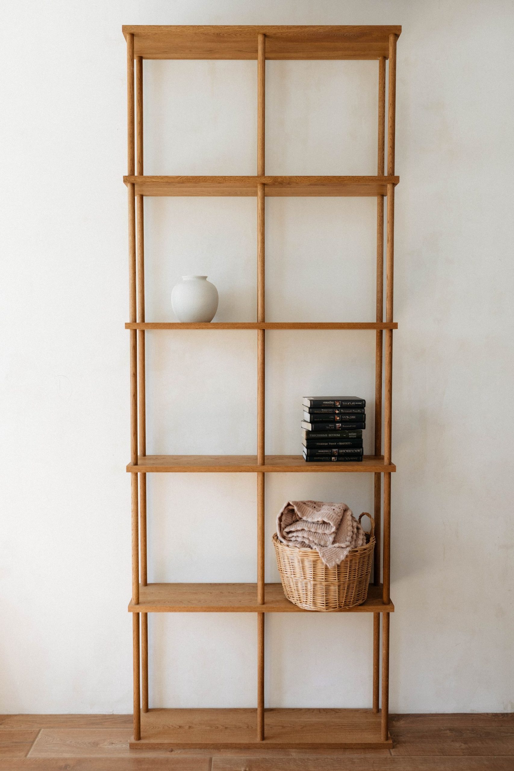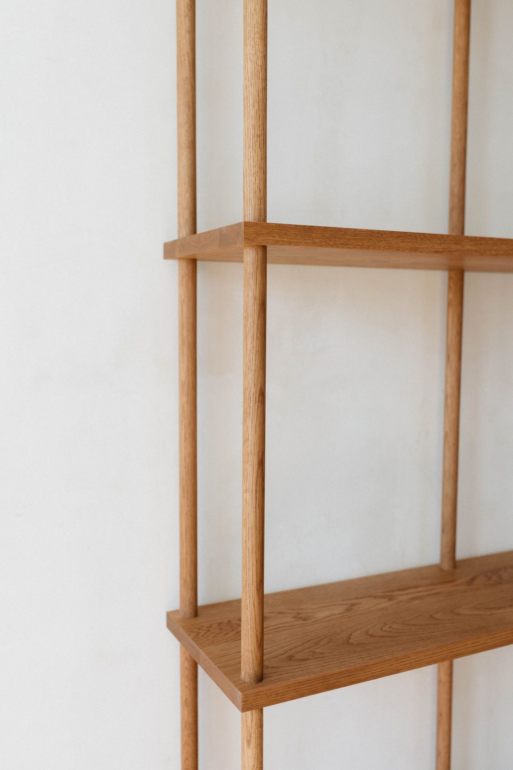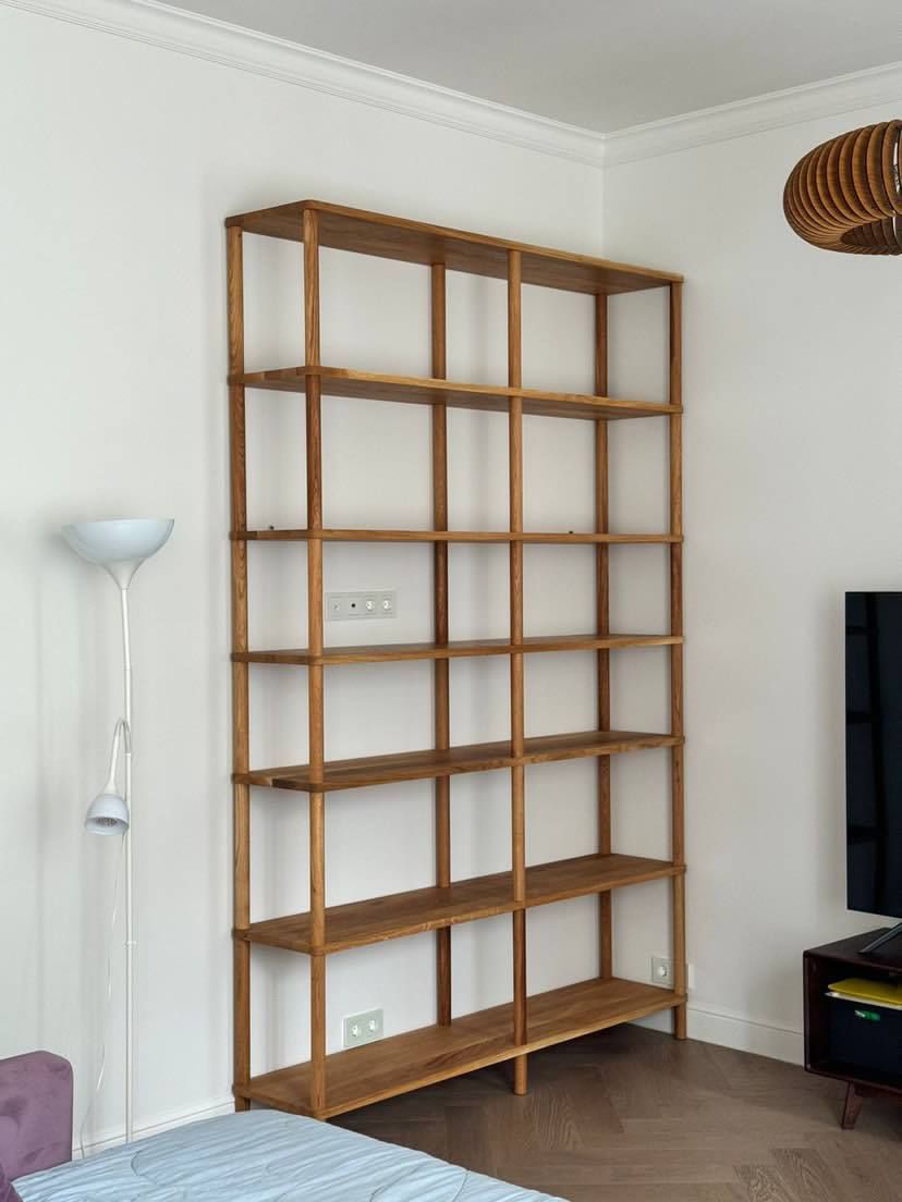 Стеллаж‑конструктор из массива дуба с открытыми полками легко подстраивается под разные сценарии хранения и декорирования. Лёгкая вертикальная система с тонкими стойками выглядит воздушно, при этом подчёркивает естественный рисунок дерева и аккуратно организует пространство.