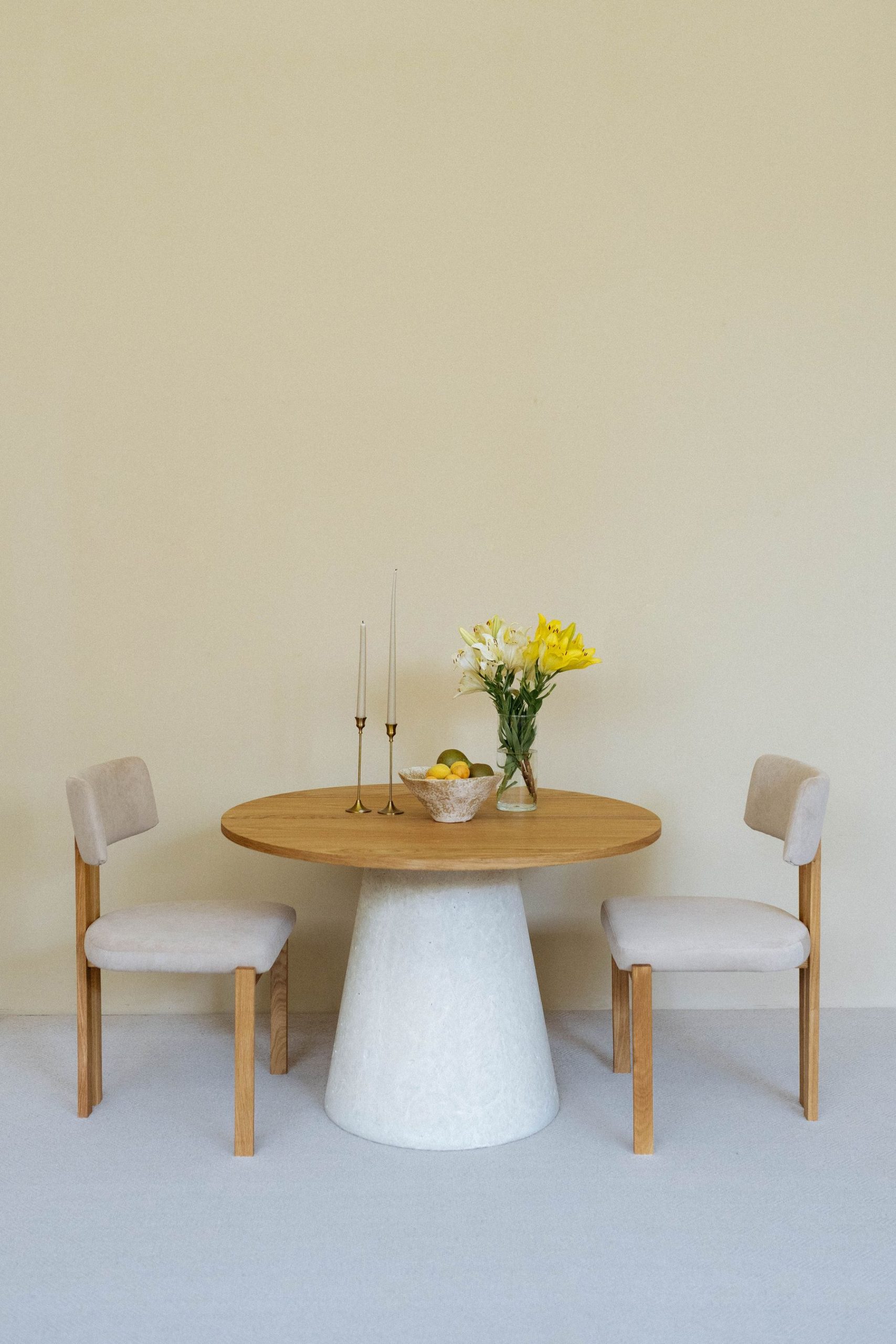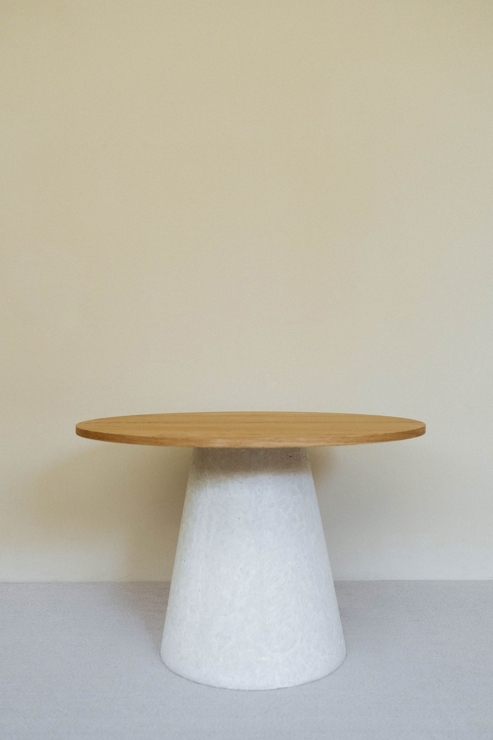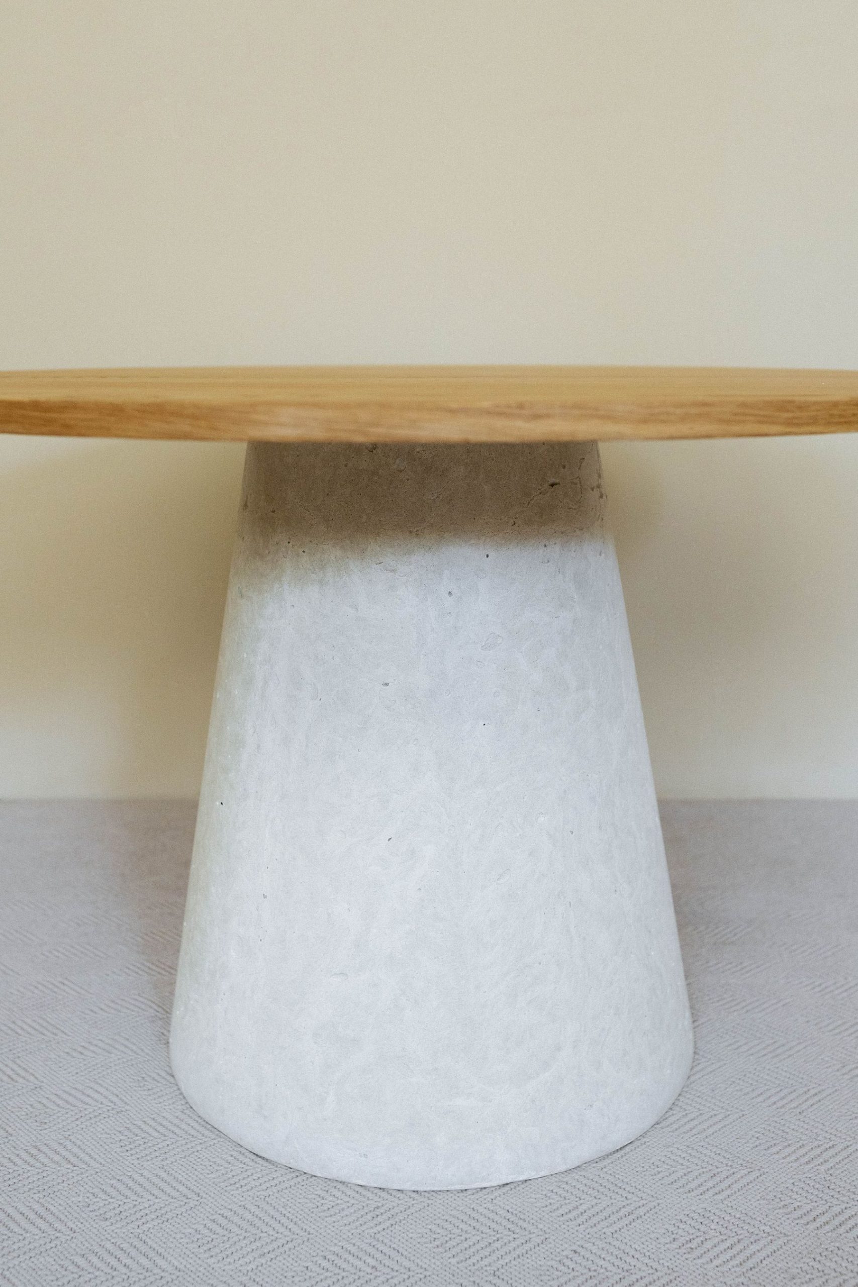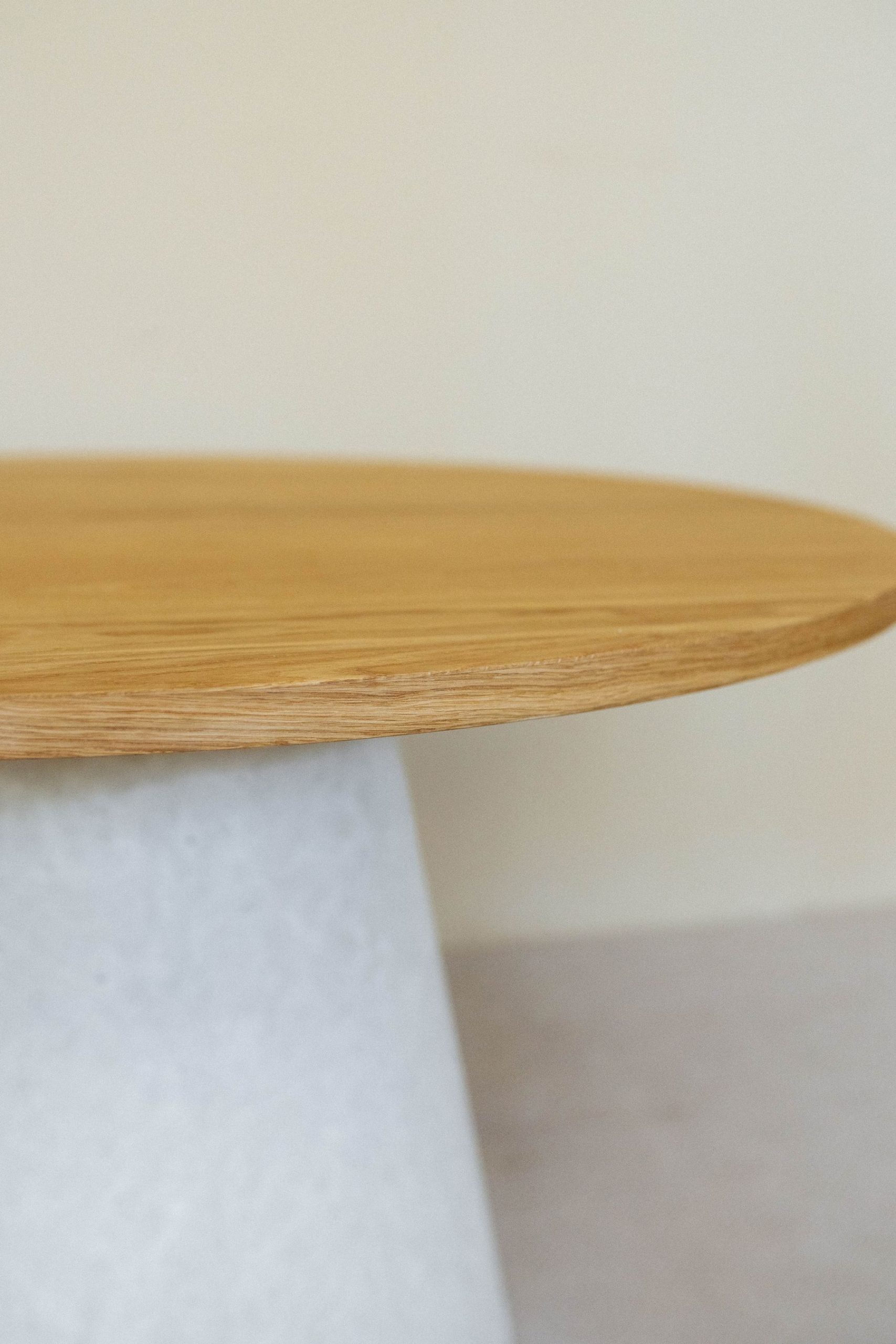 Круглый стол с бетонным подстольем и столешницей из массива дуба объединяет тактильность натурального дерева и брутальность монолитной основы. Такой стол станет выразительным центром обеденной зоны или уютного уголка для долгих разговоров за чашкой кофе.